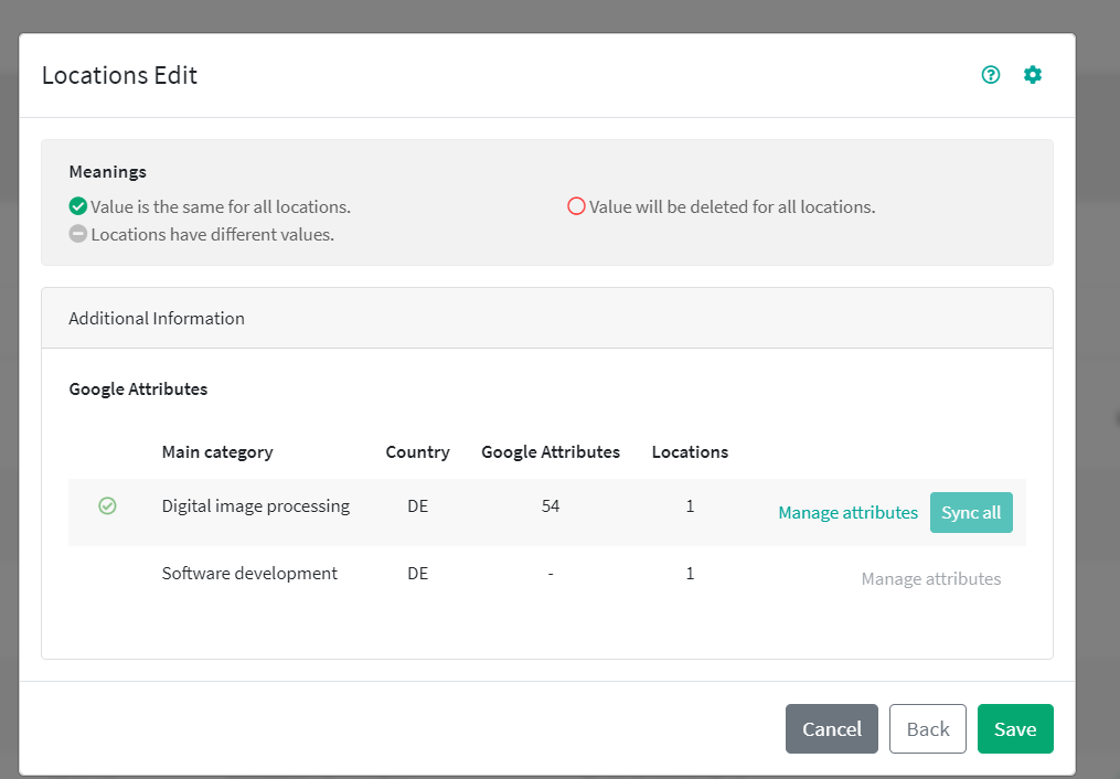 Requirement for the adjustment of the Google Attributes is the same category for all desired locations. The corresponding category must offer Google attributes. If this is not yet the case, then first change the category via batch editing as described above.