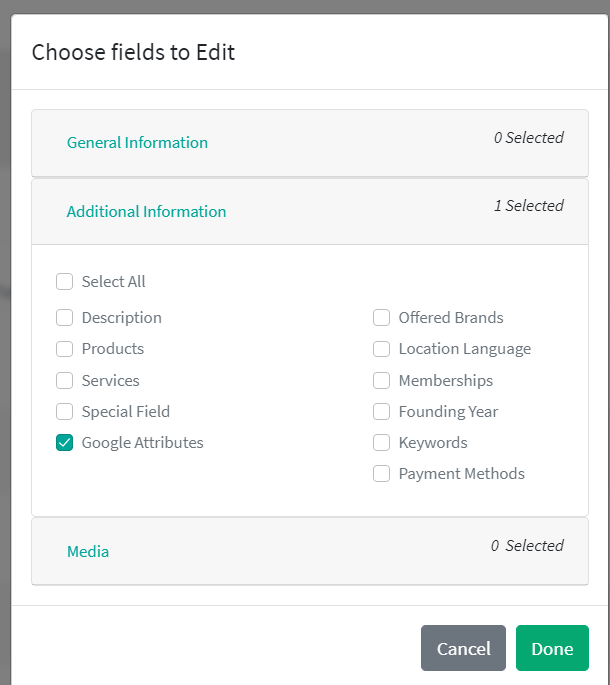 To Bulk Edit Google Attributes: You can adjust several different types of information in the same step via bulk editing. However, this does not apply to the main category and the Google Attributes in combination. Because the former requires the latter, these two pieces of information must be edited in two separate steps, one after the other.