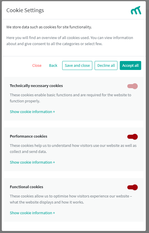The cookie settings are saved for 1 year. After this time period, the settings are re-requested via a pop-up. The settings remain saved during this period even if the browser cookies are deleted. If the settings are changed within the year, the cookie settings will be requested again from this day 1 year in the future. Example: On 12.6 the cookies are set and the 1 year begins to run. But the user changes the settings again on 30.09.. In this case, the cookie settings are only queried on 29.09. of the following year.