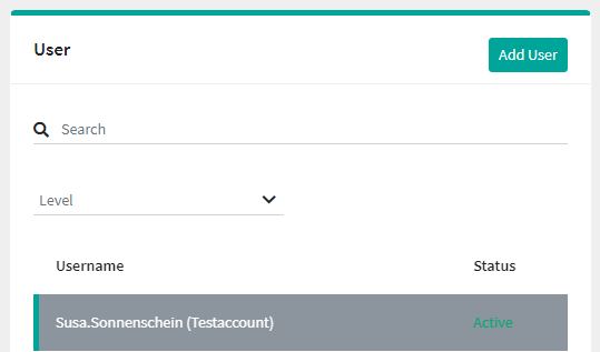 In this section you can search for a user. You can do this via the user name, first and last name or the e-mail address, or by limiting the work area via the filter function.