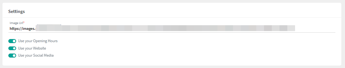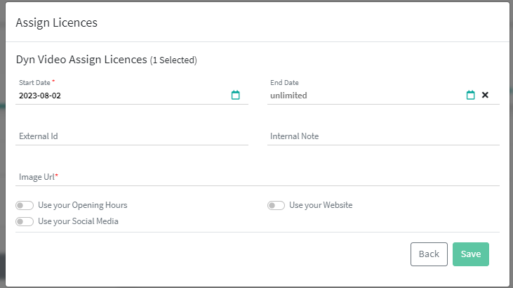 While assigning the licence and/or after assigning the licence, you can add further content to the video. This includes the display of the opening hours, the publication of the website link or the display of the social media profiles. To activate or deactivate these, use the corresponding sliders. If you want to change the external image (image URL), you can change the link at any time. However, follow the instructions in the section "Update video".