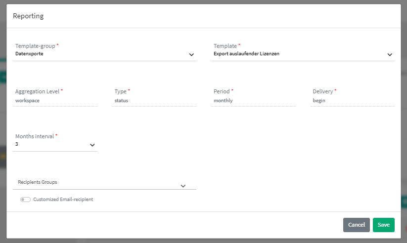 Selection options of the individual fields: Aggregation level: workspace, type: status, period: monthly, delivery: begin are already predefined so that an export is always sent workspace-wide, monthly and at the beginning of the month. Below this, the period to be considered is defined: All expiring licences in the next 1 / 2 / 3 / 4 / 5 / 6 months can be selected. Under Recipient group, the recipient lists that are assigned to this message can be selected or a user-defined recipient group can be specified (company contact or location contact as To / CC / BCC or alternatively defined e-mail address as To / CC / BCC recipient).