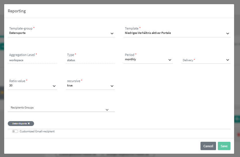 Aggregation level: workspace, type: status are already predefined so that an export is always sent workspace wide. Period: A weekly, monthly, quarterly, annual dispatch can be set here. Delivery: begin or middle defines whether the export is sent at the beginning or in the middle of the period.