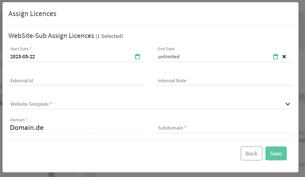 - Enter the start date of the licence Enter the start date of the maximum 2-month preview here (as of 18.08.2020). If the start date is reached, the preview is generated and during the following 2 months the licence can be activated for a paid subscription. If the website is to be launched on 15.10., the preview must be saved as the launch date on 15.08. at the earliest. In the period 15.08. - 15.10. the licence can then be activated for a paid booking, otherwise the licence expires if it is not activated during this 2-month period.