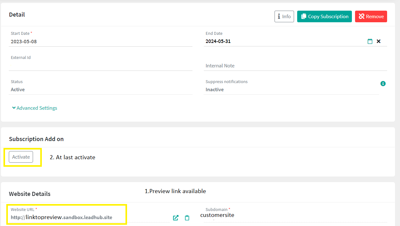 The Activate button has to be activated only when the website URL (preview) is visible.
