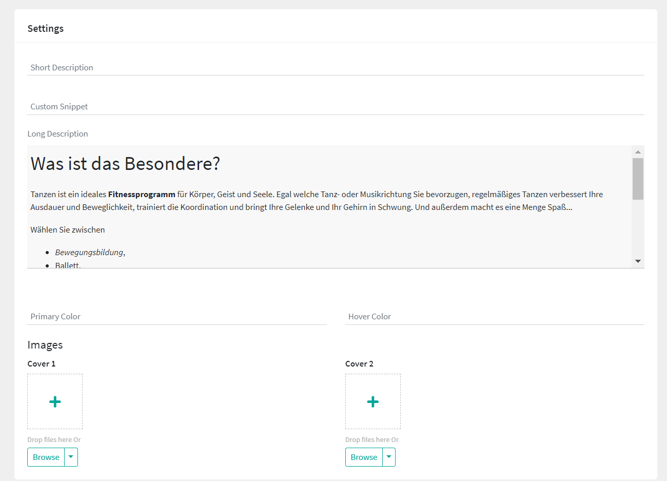 - Long description: if you click in this field, an HTML editor opens in which you can enter a long description text with formatting (h2 headline markup, font size, bold / italics, underlining, 35 font colours and bullets). The text appears on the website in the "About" section.